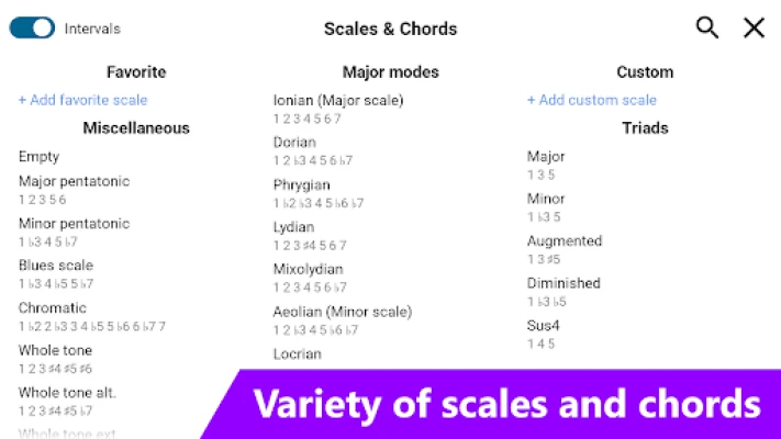 - 45+ scales (Major scale modes, Harmonic minor scale modes, Melodic minor scale modes, Major/Minor pentatonic, Exotic scales, Bebop scales) and 35+ chords