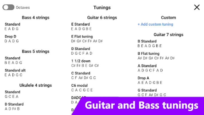 App is catered more to learning scales than chords but chords are also present and have chord shapes for main chords for 6/7 string guitar, 4/5 string bass and ukulele.