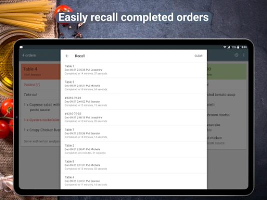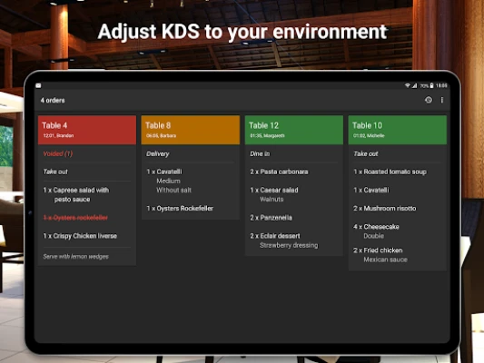 - Quickly view all active tickets with colors indicating wait time, ensuring timely preparation of each order.