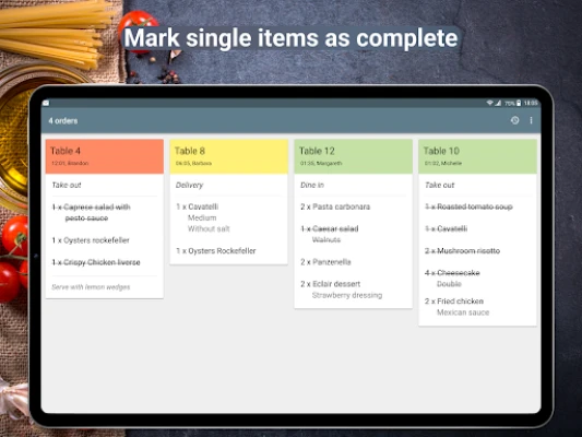 - Mark individual items or entire orders as complete.
