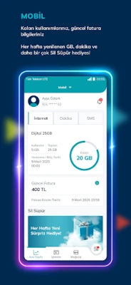 • You can review your remaining usage in your tariff and package from the Usages page of your mobile account, view your current invoice/balance, and earn GB, minutes and many other gifts by playing Sil Süpür with its gifts renewed every week.